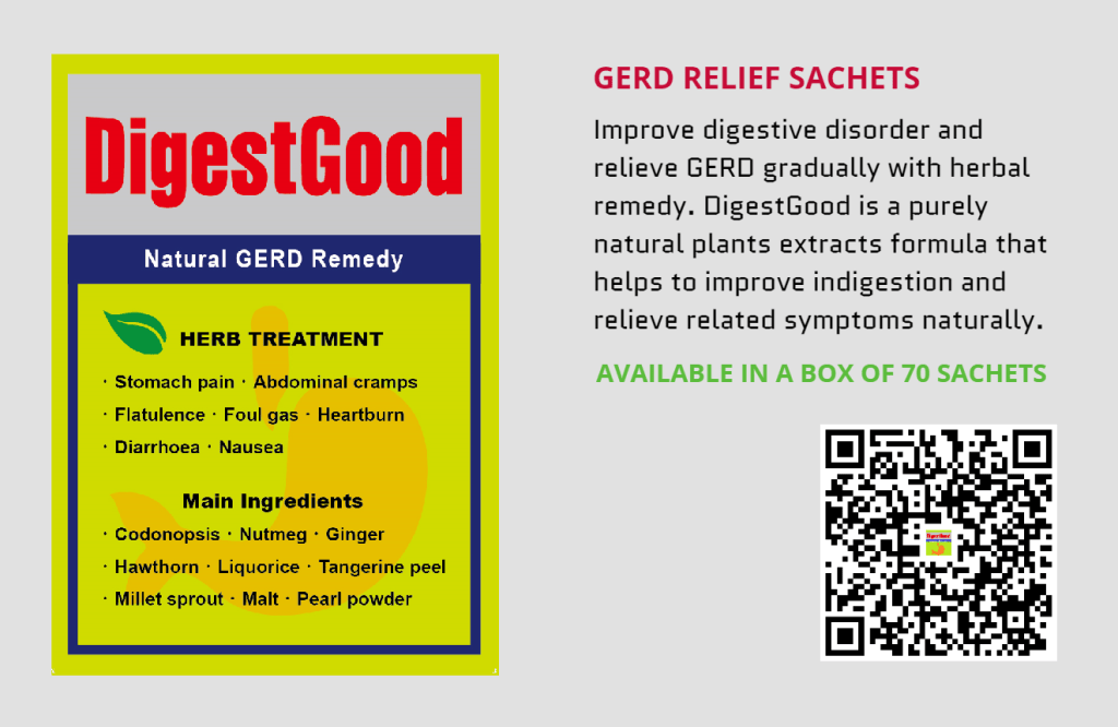If you have GERD(or acid reflux) or poor digestive symptoms like bloating, heartburn, sore throat, back pain, nausea, vomiting, diarrhea, etc. You might take DigestGood to improve your digestive health. DigestGood is designed to regulate digestive function smoothly. For example, in the case of flatulence after a meal, as long as you take 1 to 2 sachets of DigestGood immediately with warm water, the flatulence will gradually disappear after about 15-30 minutes.