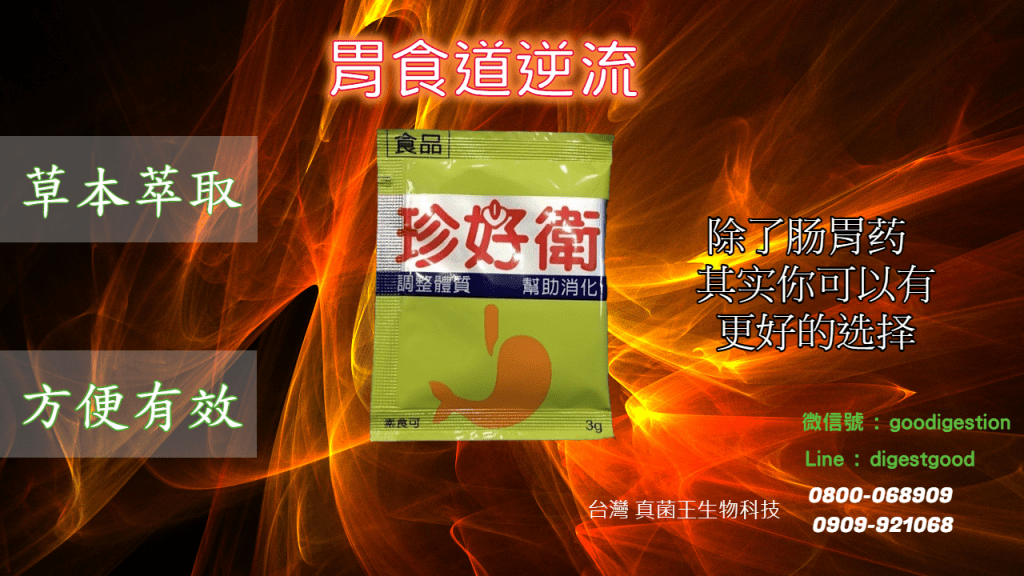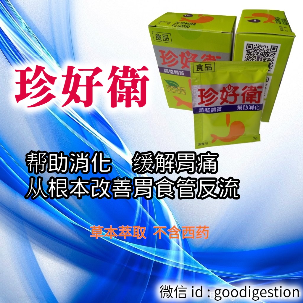 珍好衛是草本萃取的腸胃消化保健食品, 可有效幫助消化, 改善因消化不良所產生的身體反應, 如胃痛, 胃食道逆流, 脹氣, 胃堵堵, 噁心及反胃感, 胸口悶(痛), 喉嚨痛, 長期的吞嚥異物感以及腹瀉等狀況.
