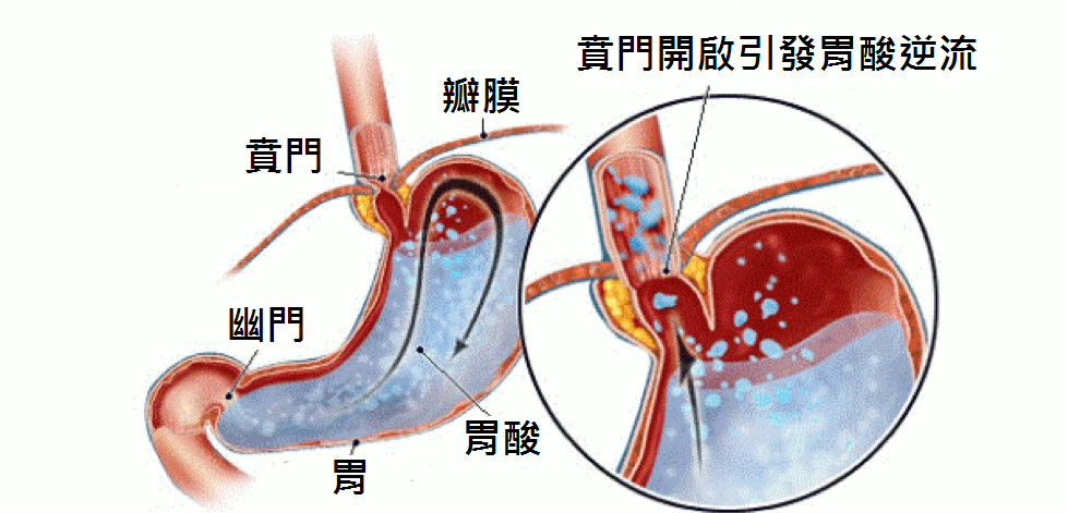为甚么胃酸会不正常流到食道?其中之一是因为食道与胃之间的贲门渐渐松弛,贲门其实是食道与胃中间的一组肌肉,一般称之为下食道括约肌,当我们吃饭时,食物会经过食道来到贲门,这时候贲门便会打开让食物进入胃中消化随即立刻关上,以防止消化过程中胃酸及消化中的液体和食物逆流而上冲到食道,而胃酸会倒着流的原因之一就是因为贲门的开关控制上变得不灵敏甚至时而失效,以致胃酸逆流进食道。另一种更为常见的原因是消化不良导致大量的气体积聚在胃里,让我们的胃受到巨大的空气压力,这时胃宛如一棵被打饱空气的气球,当胃内部的压力不断地上升,便会直接压迫到胃部上方的下食道括弱肌也就是贲门,贲门在此时为了减压将被迫打开, 把多馀的气体排出, 这就是有时吃太饱会打几个饱嗝的由来,有时胃酸和消化液会被一起夹带出来,所以我们会有些许的口酸感,偶而发生这种状况不至于有什么影响, 但要是有经常性的消化问题没改善(像是饭后常常会胀气或嗳气打饱嗝), 贲门在长期承受过度压力下便会开始变得松驰而导致工作中的胃酸和消化不全的食物及半发酵的液体容易随之向上溢出,这也正解释为何有胃酸逆流症状的人经常性会有感到口酸 口苦或是甜味。