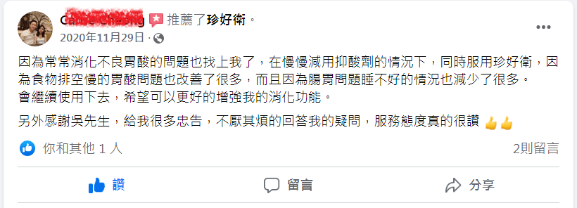 | 因為常常消化不良胃酸的問題也找上我了,在慢慢減用抑酸劑的情況下,同時服用珍好衛,因為食物排空慢的胃酸問題也改善了很多,而且因為腸胃問題睡不好的情況也減少了很多。 會繼續使用下去,希望可以更好的增強我的消化功能。 另外感謝吳先生,給我很多忠告,不厭其煩的回答我的疑問,服務態度真的很讚 |